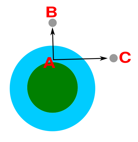 Un osservatore che si trova sulla Terra (rappresentata schematicamente dalla sfera verde) nel punto A e osserva la Luna nella posizione B percorre con lo sguardo uno spessore minimo di atmosfera (la sfera azzurra non in scala per maggiore chiarezza), mentre se osserva la Luna quando è bassa sull’orizzonte lo spessore di atmosfera che deve superare con lo sguardo è molto maggiore e questo filtrerà le componenti di luce azzurra e blu dando l’impressione che la Luna sia rossa.