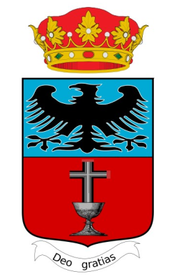“Nel 1° d’azzurro all’aquila di nero, nel 2° di rosso alla croce poggiante nel calice tutto d’argento”