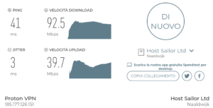 Ecco un esempio delle modifiche introdotte usando una VPN che in questo caso ha modificato IP, gestore e luogo di accesso. Se facciamo un test di velocità … troviamo valori accettabili (ma la connessione è in fibra da 1 Gb) e soprattutto stabili come attestato dai grafici al centro. Velocità di 92 / 40 erano impensabili pre fibra e anche i valori di ping e jitter sono contenuti, ma questi valori sono ritenuti bassi dai gamer ma soddisfacenti negli utilizzi di lavoro e personali.